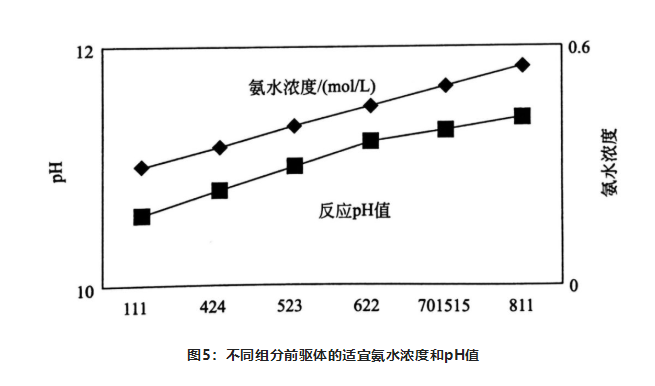 氨水是反應(yīng)絡(luò)合劑,主要作用是絡(luò)合金屬離子,達(dá)到控制游離金屬離子目的,降低體系過飽和系數(shù),從而實現(xiàn)控制顆粒長大速度和形貌。所以制備不同組成的三元前驅(qū)體,所需的氨水濃度也不同。