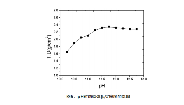 隨著沉淀pH值升高,一次粒子逐漸細(xì)化,顆粒球形度變好,前驅(qū)體樣品振實密度逐步升高。